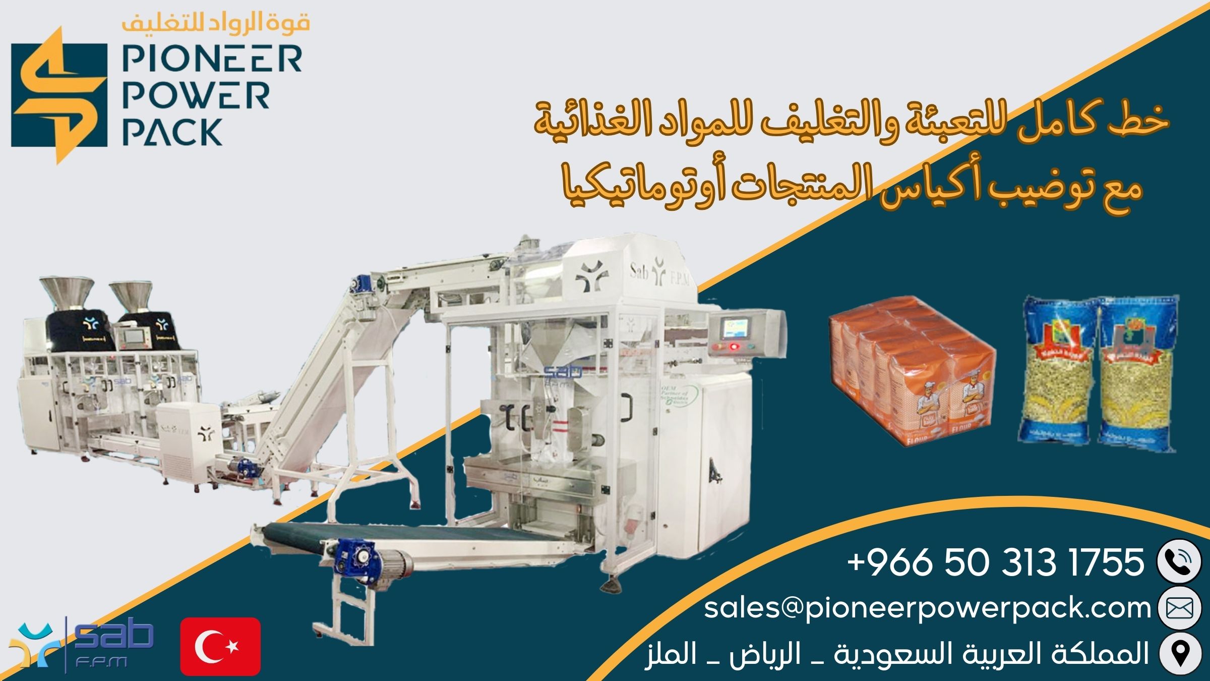 A complete food packaging line with automatic product bag packing
